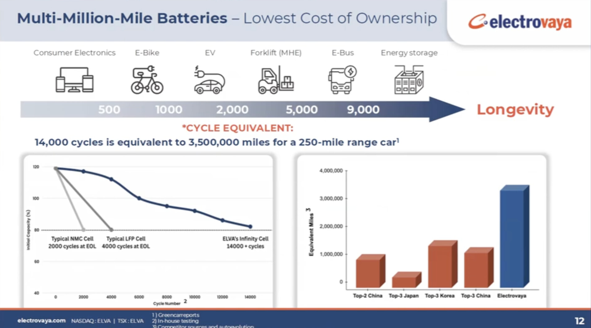BTW, Electrovaya has previously described its product as “a million mile battery,” but do not compare with car/truck batteries , which have different operating requirements. For instance, Electrovaya’s best battery has a WH/Kg (Watt-Hour to Kilogram) ratio of 171 while Tesla’s batteries are between 260 and 295 today. It’s fine for a forklift to be heavy - it’s actually considered a good thing to help counterbalance the weight of what it’s carrying on the forks! Not so much for passenger cars, where it adversely impacts range.