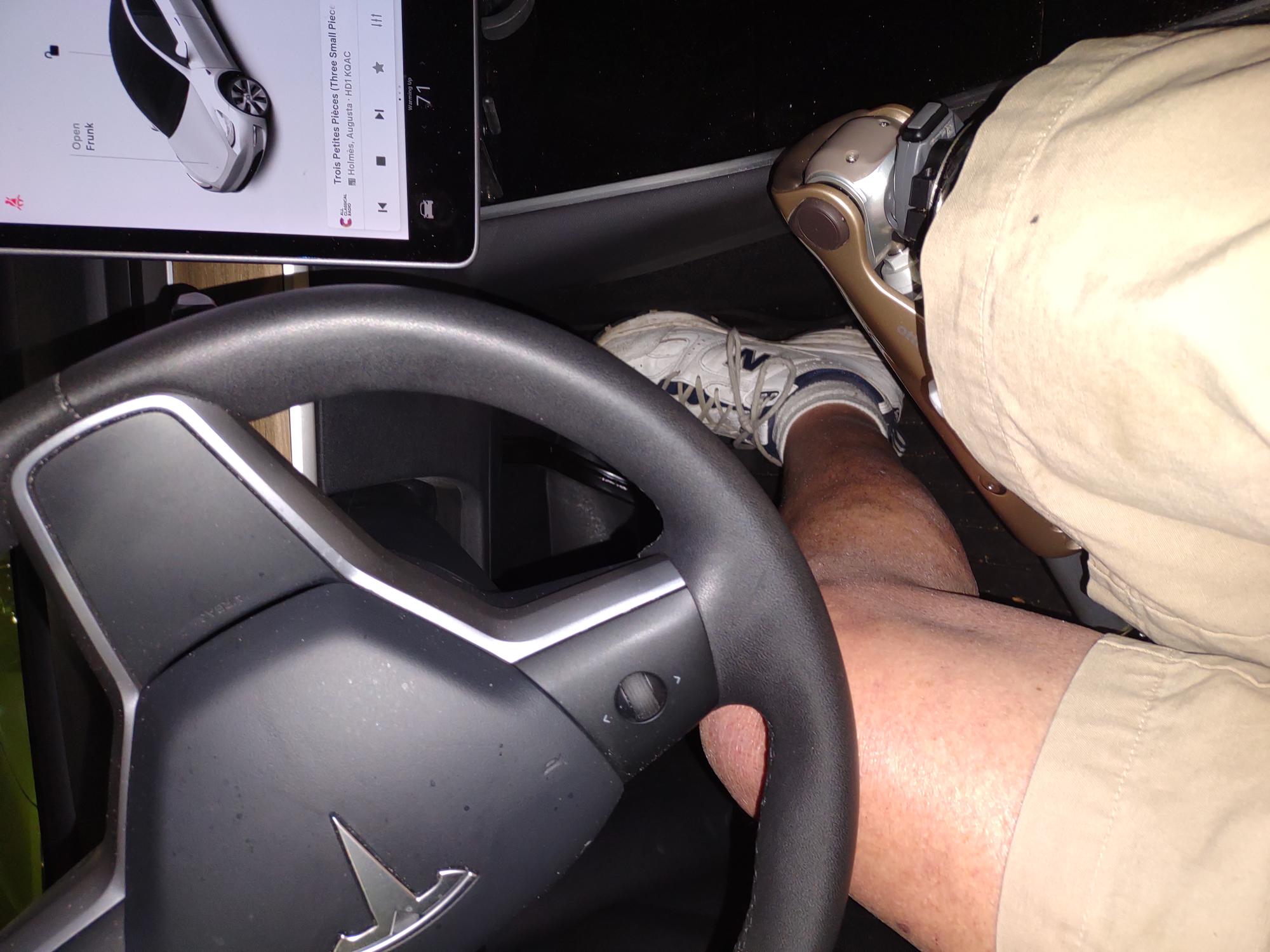 On Wednesday, my prosthetist installed a 360 degree swivel joint at the knee that allows me to rotate the lower limb like a windmill. I can now get the knee well out of the way of the steering wheel.