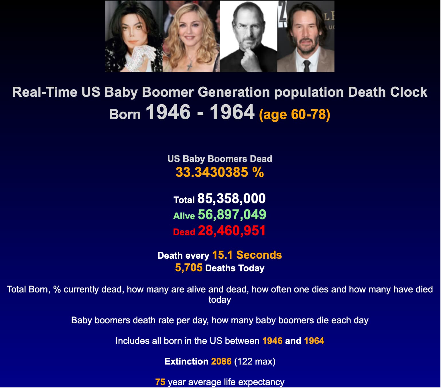 And here is a macabre “boomer death clock” that claims that 33% of boomers, or 28 million have already died.