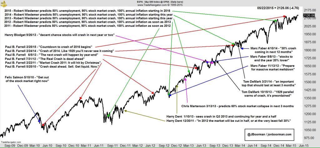 Given all that, and that no one can forecast the market, here is my attempt to do so. Sure this has been a long Bull market. But this isn’t a euphoric market that charged out of the Great Recession. It has inched its way up slowly, climbing a wall of worry all the way. And it had, and could still have, a long way to go. Does this feel like a frothy market top? Do you hear any euphoria? Have you heard anyone calling for a massive market rise, anyone at all? Does everyone seem worried about one thing or another? And the market keeps inching up. The economy is growing, unemployment is falling, employment is rising, there’s no inflation, NO inflation, and no wage inflation. The market usually continues to rise for two years after the Fed starts raising rates, and they’ve just made one token little step. Give me a break! Relax and have fun investing. Sure, a correction will come along sometime, but we’ll all live through it. — I wrote that paragraph for the 2015 version of the KnowledgeBase and boy was I right. It still makes sense. Here is a wonderful compilation of all these guys who predict a stock market crash every year (often using the exact same words even, from year to year). It’s worth clicking through on it: https://pbs.twimg.com/media/CGVzK7_VIAAyCSH.jpg:large