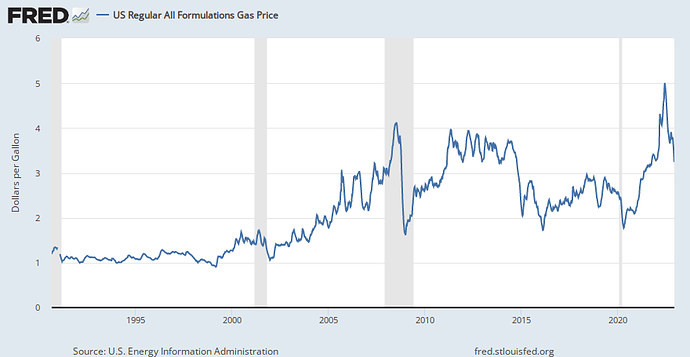 The price of Crude Oil Prices: West Texas Intermediate (WTI) peaked at $123 on June 8, 2022. It’s now $73 a barrel.