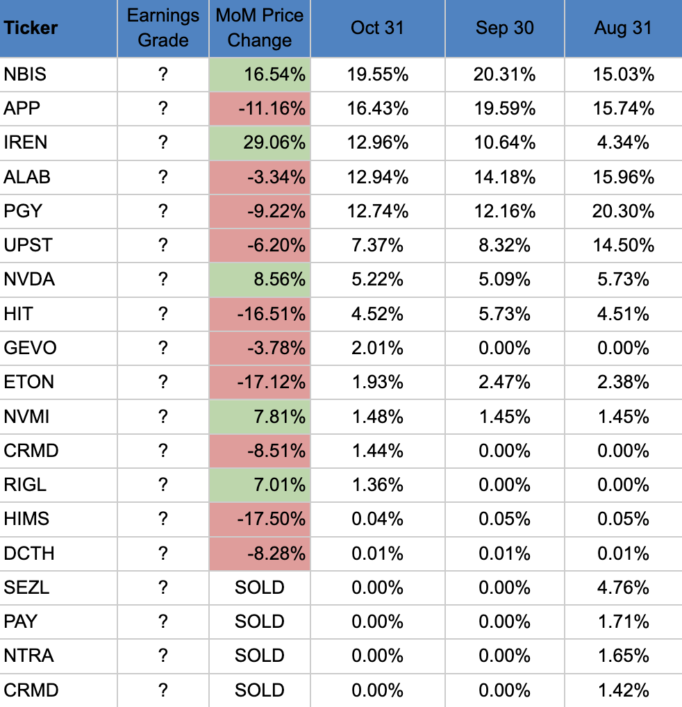My musings last month turned prescient for my portfolio as the music did finally stop in October, with my first month in the red since March, albeit less than 1% down. My only stocks that performed well were in AI, and all other sectors were down, especially smaller caps. Almost all of this was macro related with the trade war. Since many of my companies don’t publish a ton of news in between earnings, my portfolio seems to be pretty susceptible to macro factors - interesting given the recent chatter about “hype stocks” on the board.