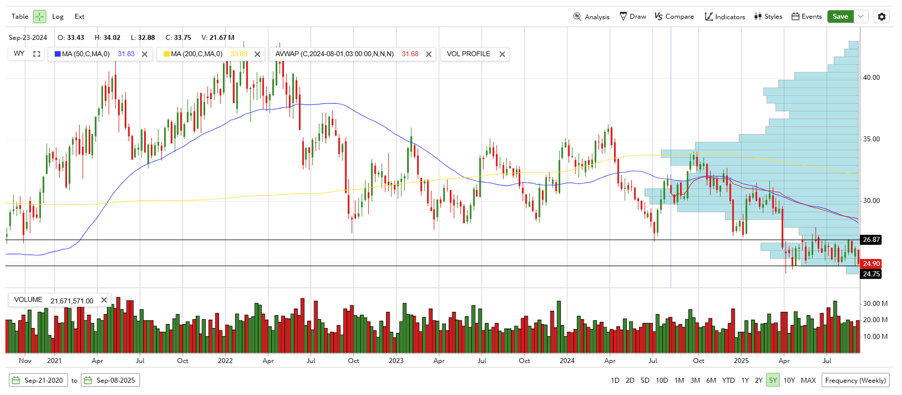 Here is the latest weekly chart. While REIT’s in general didn’t experience sell off during obliteration day and has since recovered, $WY had not recovered and established new trading range. I closed all the puts I sold for Oct $22. This is a very tight range and watching whether this range breaks down.
